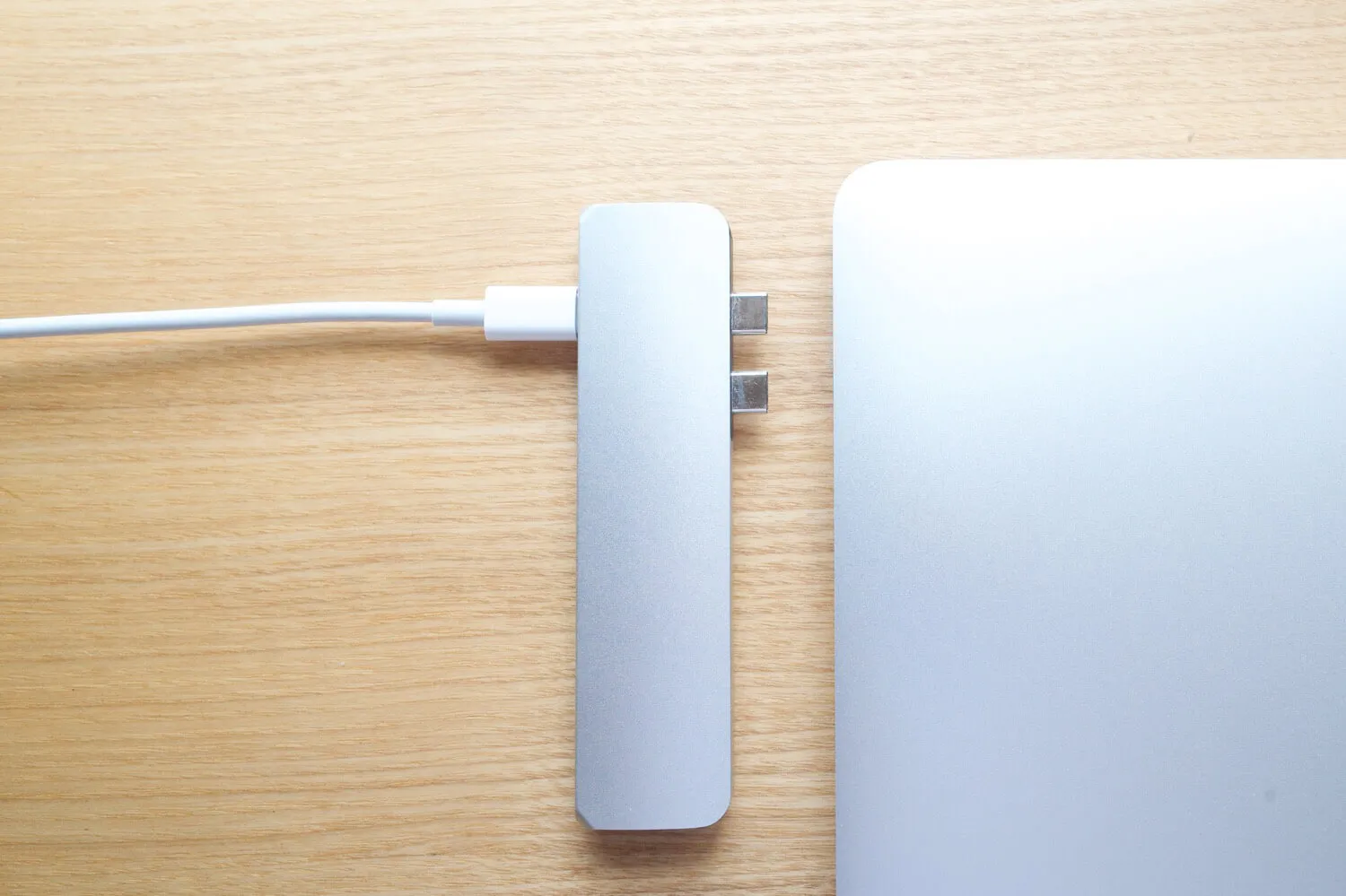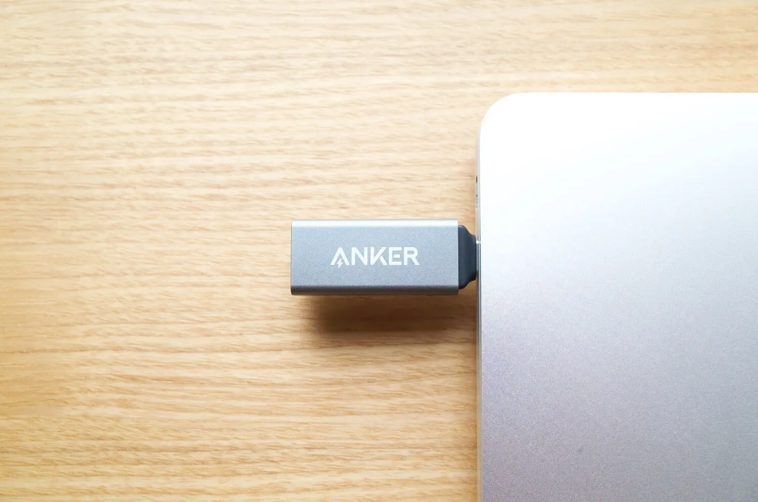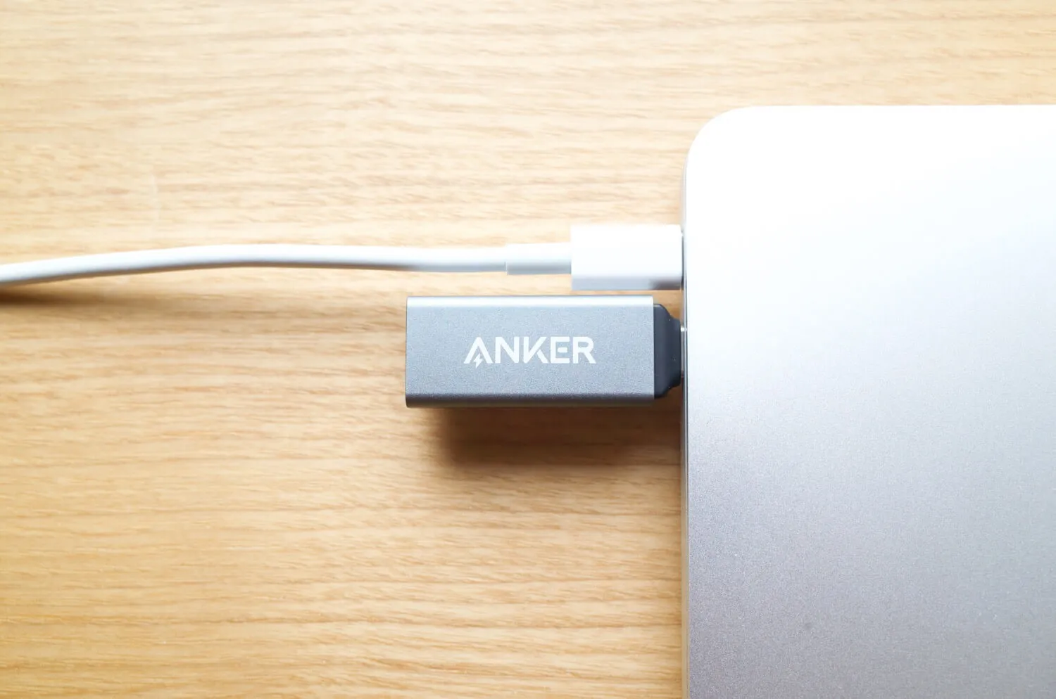本体が小型かつ細身であるというのもポイント。 写真のように、本体奥側のもう一つのUSB-Cポートと干渉しない。そのため、他の接続機器をいちいち取り外す必要がなく便利。 本体はアルミ製で軽いため、USB-Cポートに余計な負荷が掛かる心配はなさそうだ。