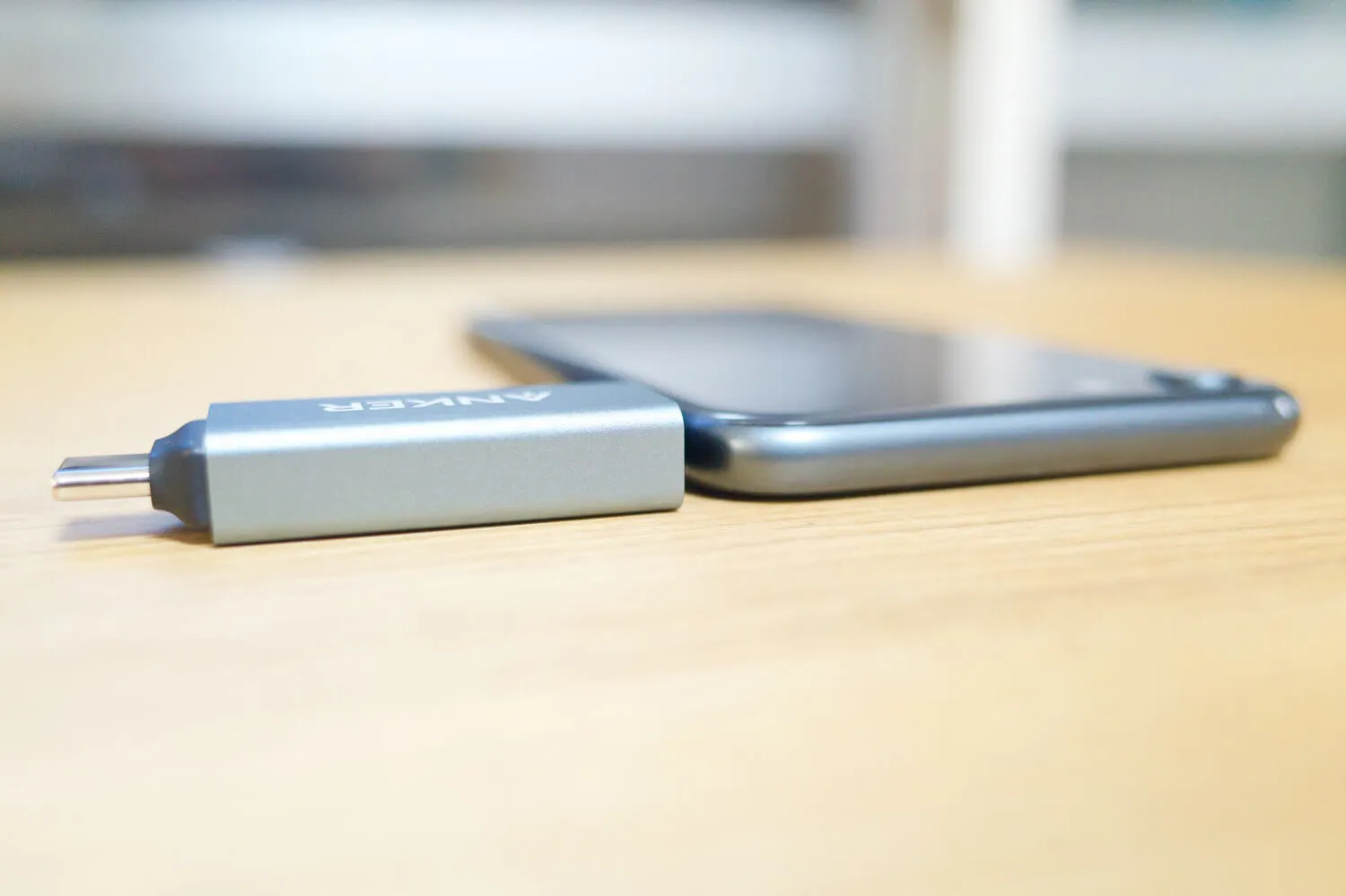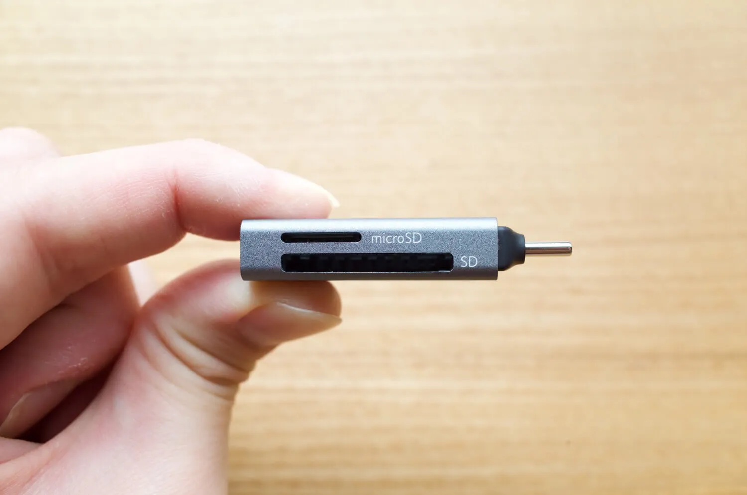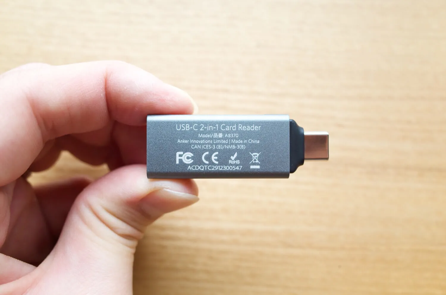 しかし、これらの手法にはいくつか問題があり、転送に手間が掛かる。 ①の手順の場合、SatechiのUSBハブはUSB Type-Cを2スロット占有するため、すでに別の機器を接続していた場合、接続を一度解除し、再接続する必要が出てくる。 充電ケーブルであればそこまで気にならないのだが、外付けSSDや外部ディスプレイの場合、一旦接続が解除されると、データの転送が中断されたり、画面のレイアウトが乱れたりするのは気にかかる。 ②の手順の場合、転送が2度手間になるのはもちろん、iPhone上に不要な画像が蓄積され、本体の容量が圧迫されるのが気になる。転送のたびにいちいち削除するのも面倒だ。 今回、これらの転送の手間を解決するべく、USB-C接続に対応するSDカードリーダー「ANKER USB-C 2-in-1 Card Reader」を購入した。