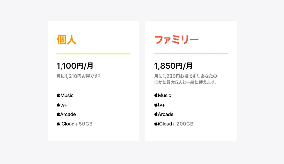 「Apple One」の月額は個人プランが「1,100円」、ファミリープランが「1,850円」。Appleのサブスクリプションサービスを多く利用している人ほど、オトク感が増す価格設定だ。