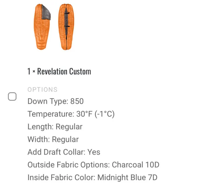 標準モデルで選択できるのは、フィルパワー、適応温度、サイズ、Draft Collarの有無、決められた生地の組み合わせのみ。