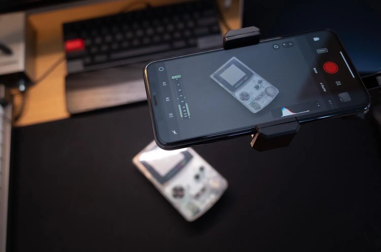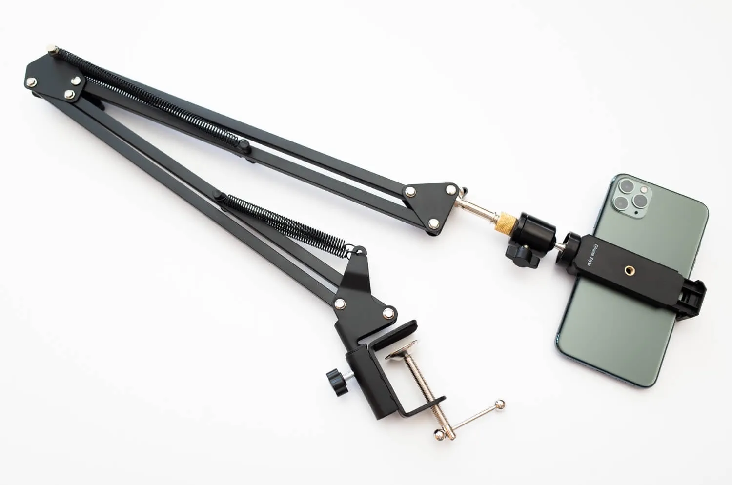 スタンド設置後、クリップ部分にiPhoneを固定し、デスクと水平になるように設置する。
