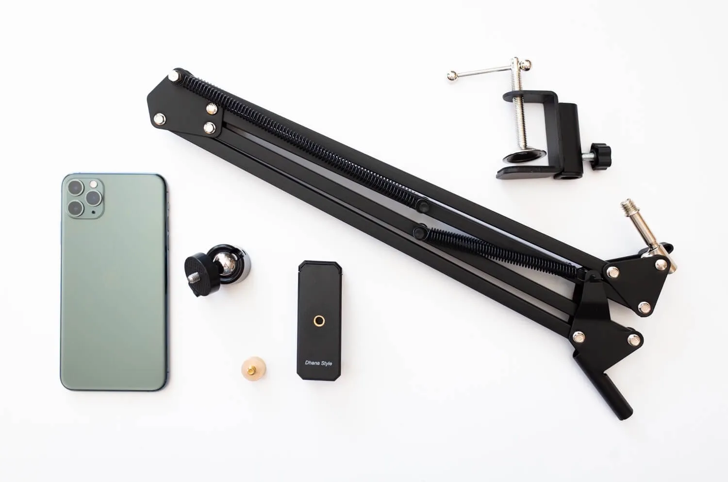 元はマイクスタンドであるため、アーム部を折り畳むと非常にコンパクト。アルミ製のため、デザインや質感もそこまで悪くない。