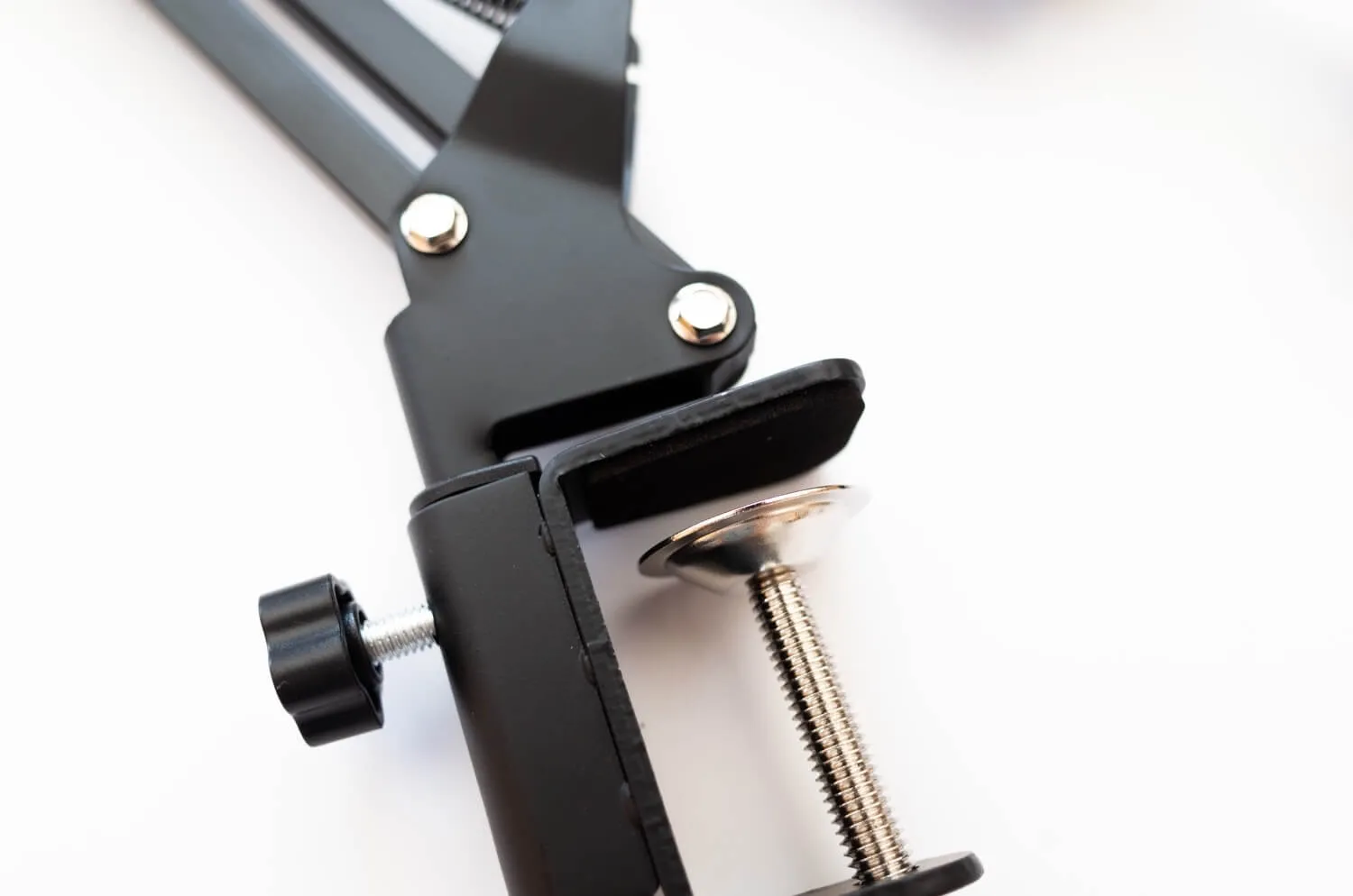 スタンドは付属のクランプで固定。ボクの場合、天板が2cmなので余裕で設置できた。厚さ5.5cmまで設置可能とのこと。