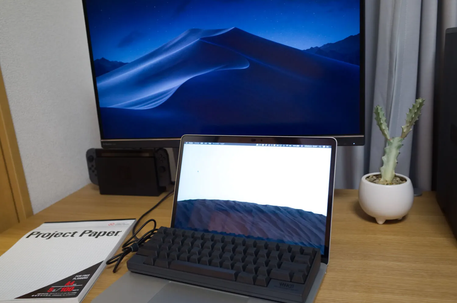 モニターアームを導入すると、明らかにデスクがスッキリしたのが分かる。 以前までモニターが設置されていた場所に、キーボードやMacBookがスッポリ収まった。結果、デスクがノートPC一台分広くなっている。これでブツ撮スペースは十分。モニターアームのおかげで、広々とした明るい撮影環境を構築できた。