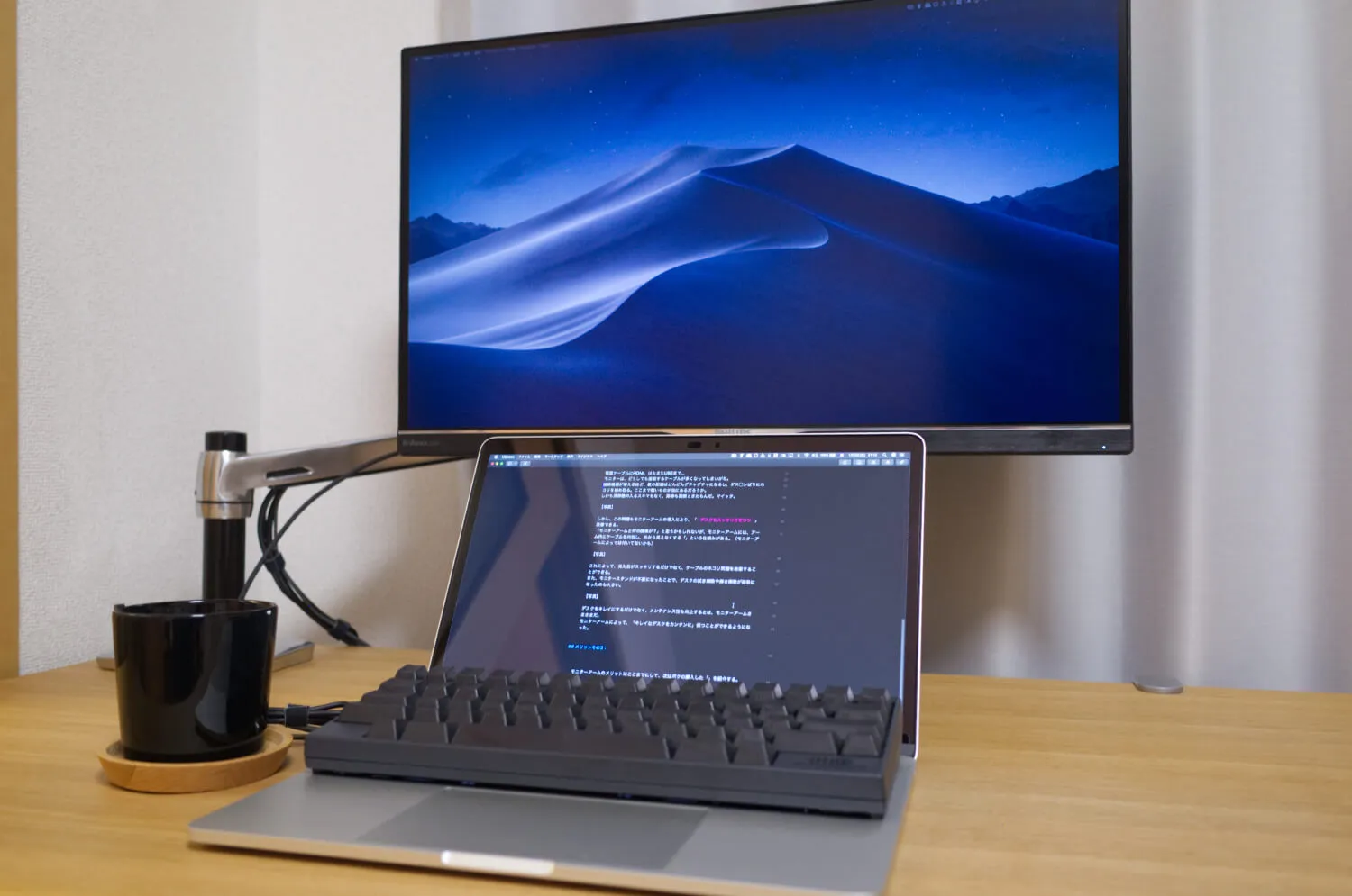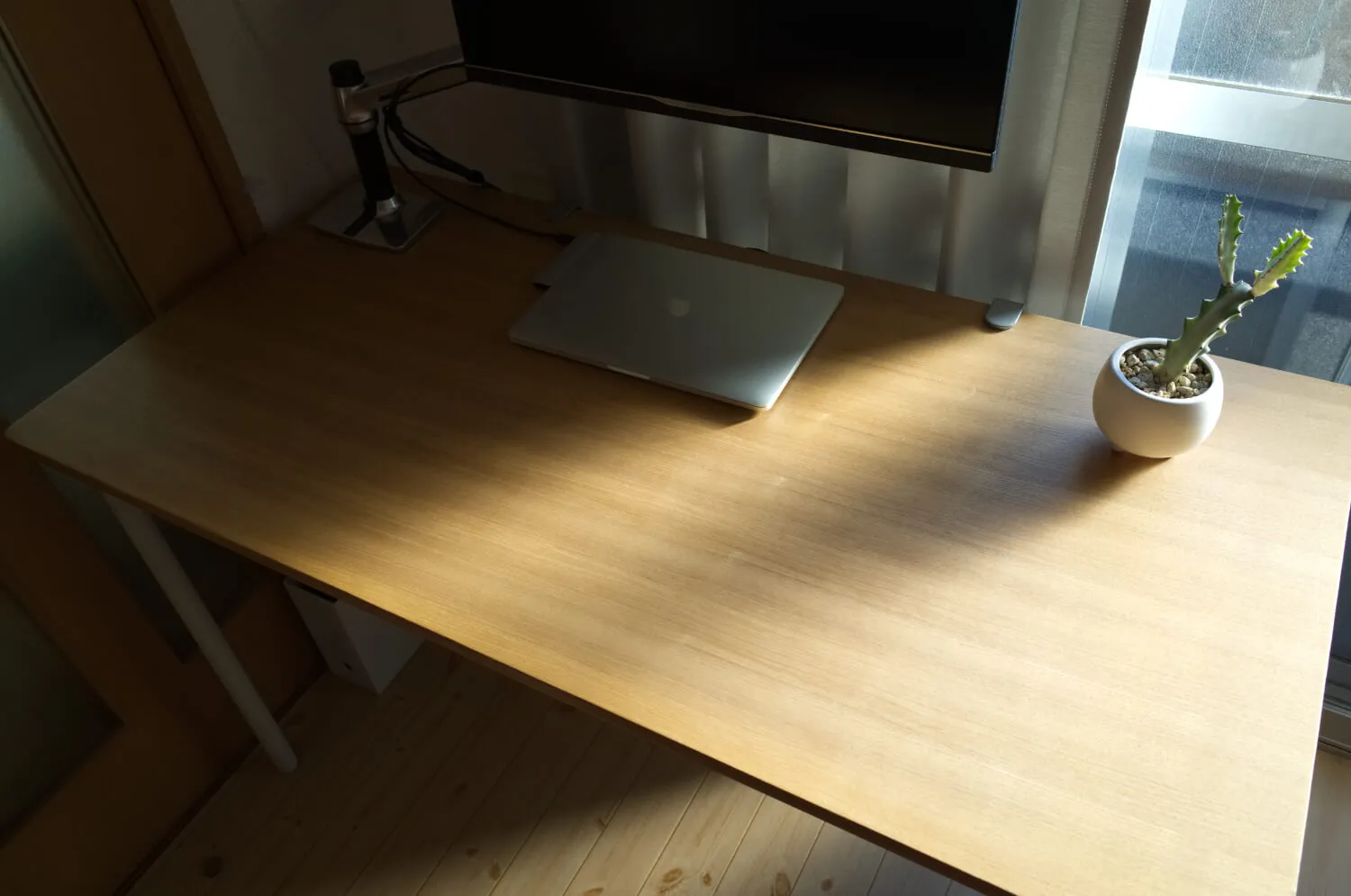 そこそこキレイだと自負していたデスク環境だが、中央にモニターがドッシリ構えている。モニタースタンドがゴツイせいか、イマイチスッキリしない見た目になっていた。