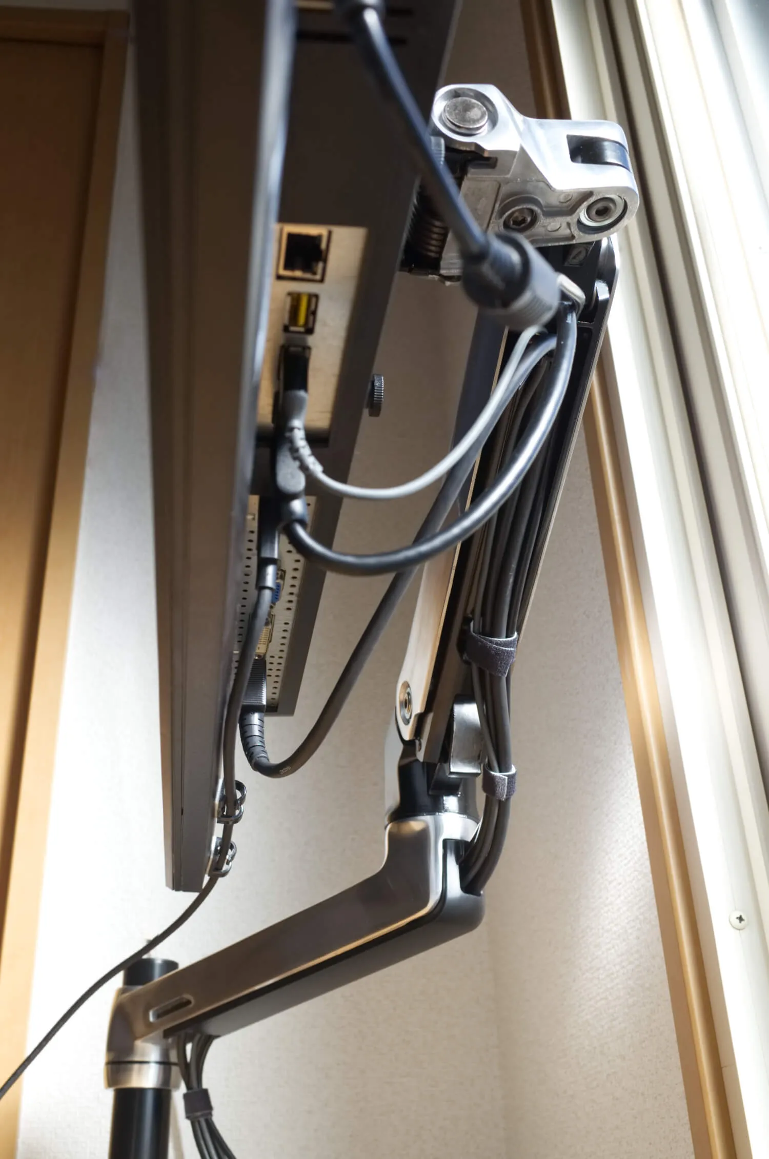 電源ケーブルにHDMI、場合によってはUSBケーブルと、モニターは、どうしても接続するケーブルが多くなってしまいがち。 接続機器が増えれば増えるほど、配線はどんどんグチャグチャにダス◯ンばりにホコリを絡め取る。ここまで醜いものが他にあるだろうか。 しかも掃除機で掃除するスキマもなく、掃除も面倒ときたもんだ。マイッタ。 モニターアームには、アーム内部にケーブルを格納する「ケーブル収納スペース」が用意されている事が多く、デスクをスッキリさせつつ、ホコリ問題を未然に防ぐことができる。