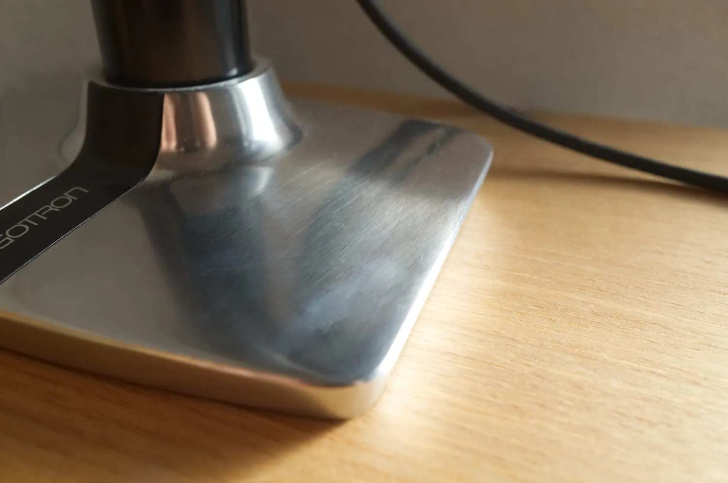 「エルゴトロン LX」に使われている「ポリッシュドアルミニウム」という素材は、あの高級チェアで有名な「ハーマンミラー」の素材にも使われるほど。 つや消し加工によって抑えられた反射が控えめで主張しすぎず、金属ならではのヒヤリと冷たいような素材感が非常に美しい。 脇役ながら、iPhoneやMacのような機能美を感じることができる。