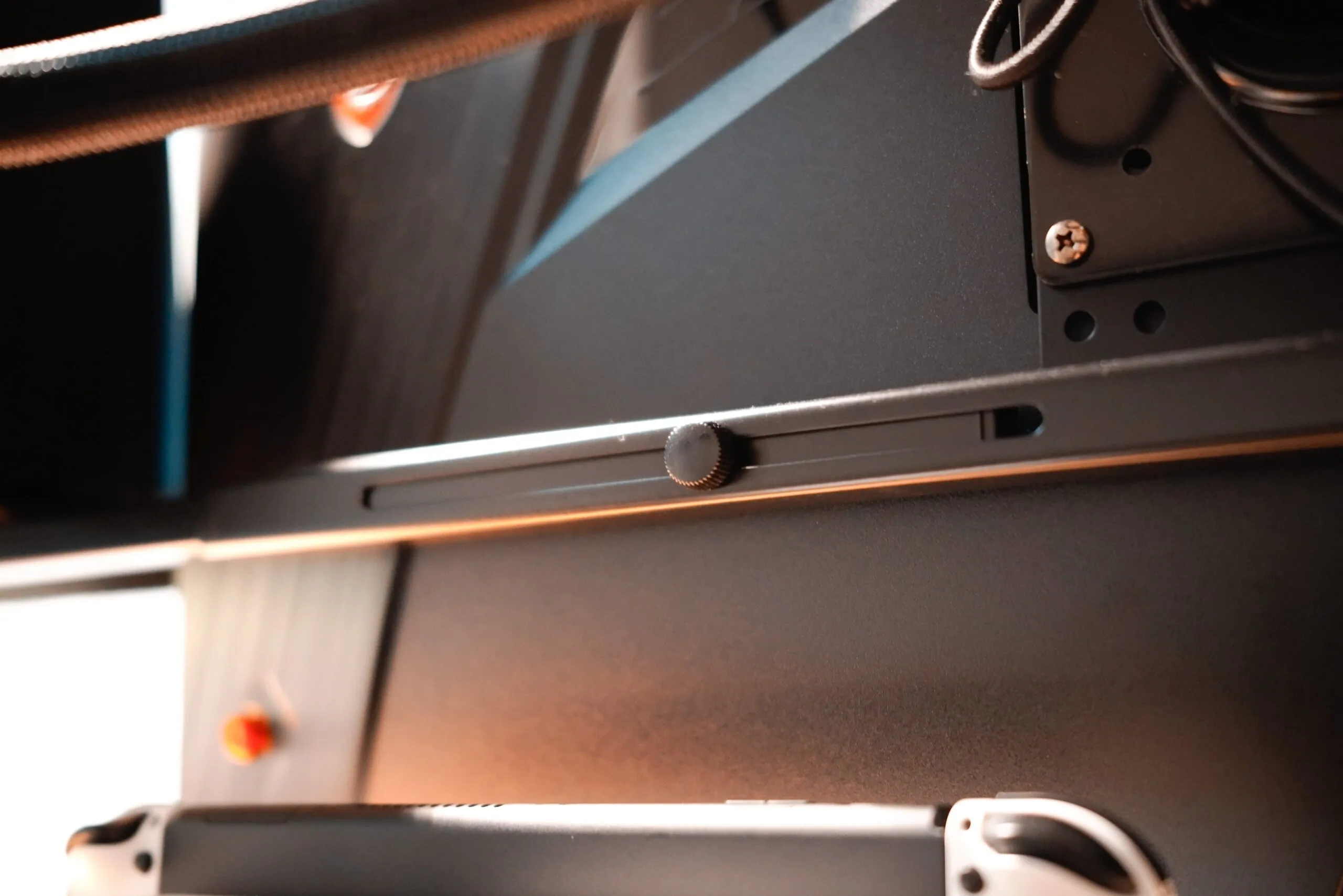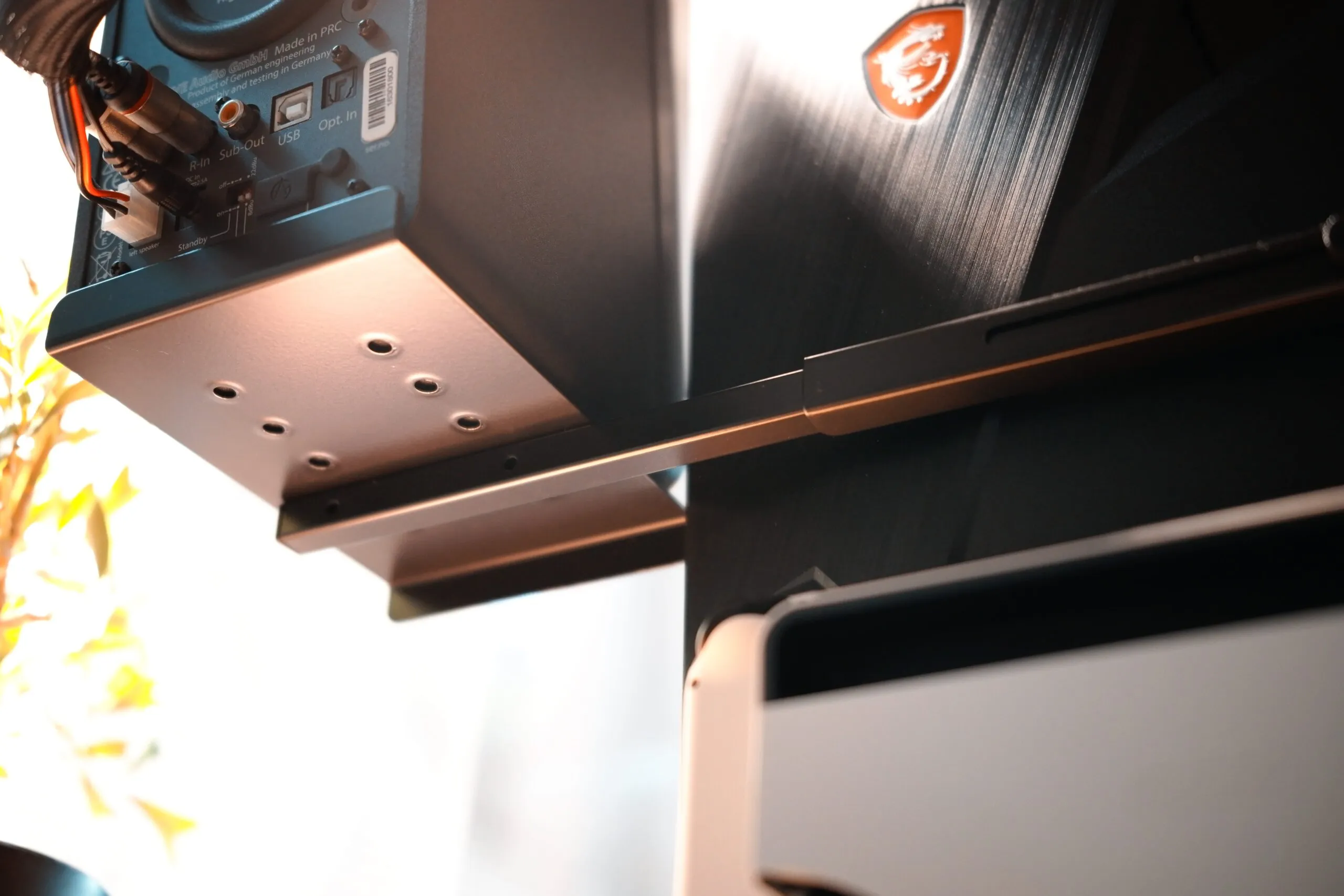 奥行は「5段階」、それぞれ「2cm刻み」で調整可能。 基本はモニターとスピーカー面をツライチで揃えるのがキレイだが、前めに固定することで背面が狭い環境でも設置できたりと、調整の幅はかなり広い。