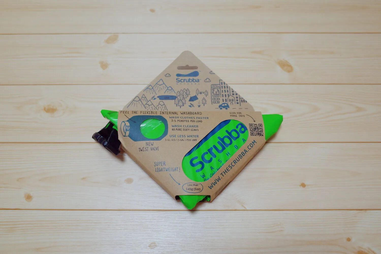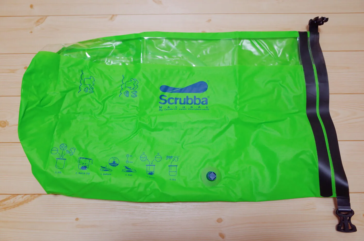 「scrubba washbag」を簡単に説明すると、 「携帯用洗濯袋」。 中に洗う衣類、洗剤、お湯か水を入れて揉むことで、洗濯機のような役割を果たしてくれる。